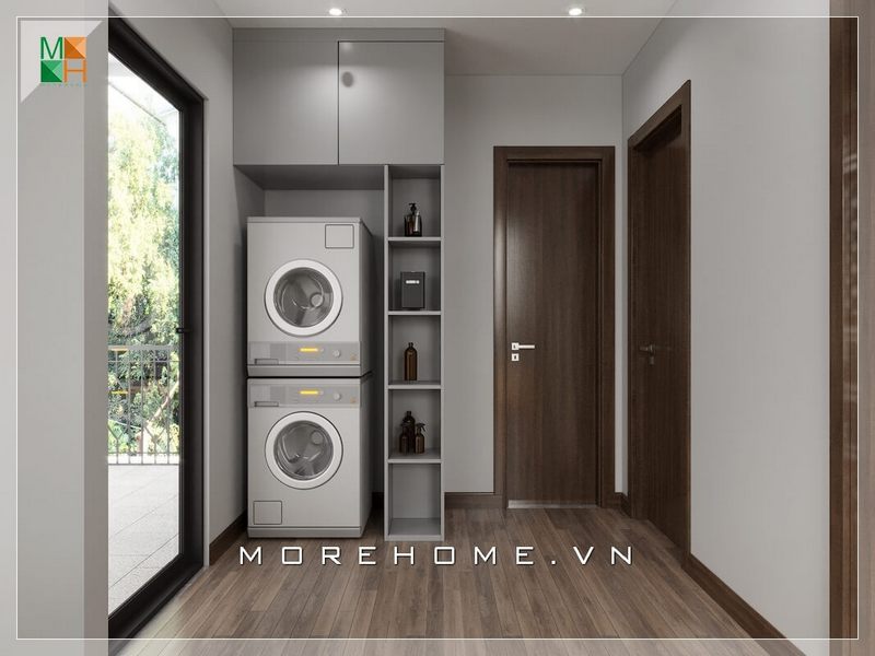 Tủ kệ đựng đồ trong phòng giặt của nhà phố tiện lợi ngăn nắp giúp người nội trợ thêm thuận tiện dễ dàng hơn.