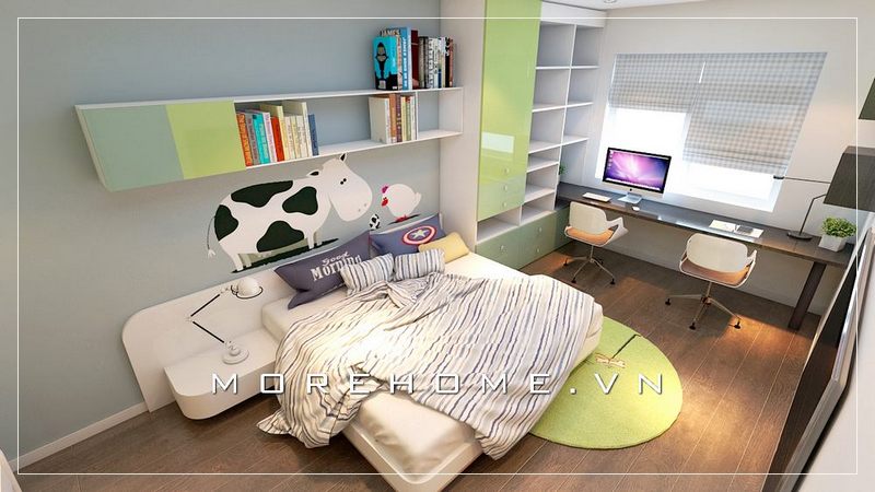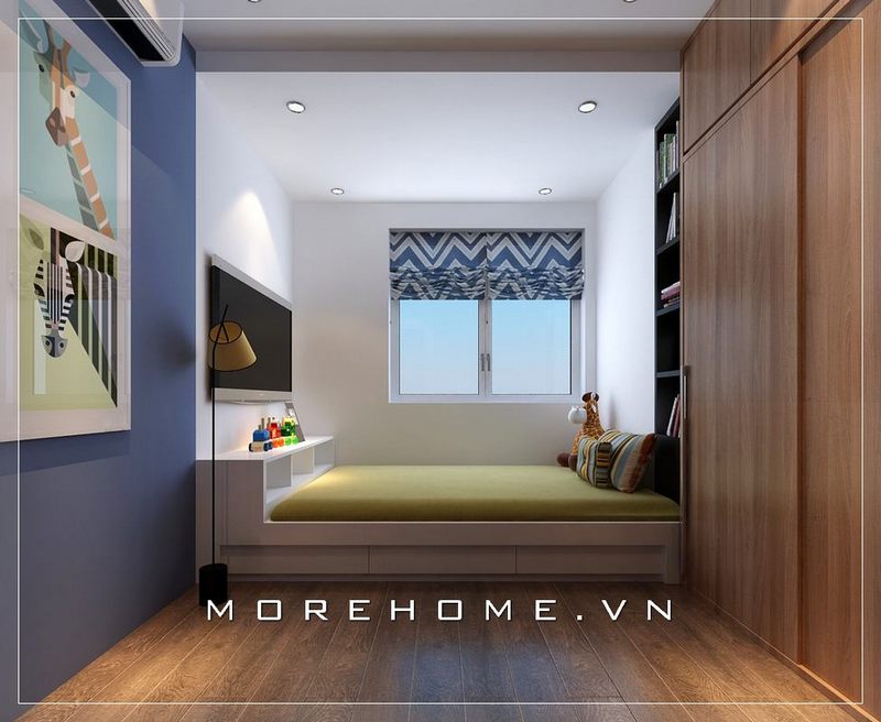 Thiết kế giường ngủ trẻ em hiện đại có ngăn kệ tủ phía dưới giúp bé có thêm không gian để cất giữ đồ đạc của mình