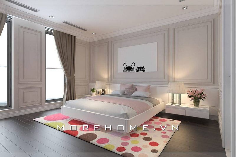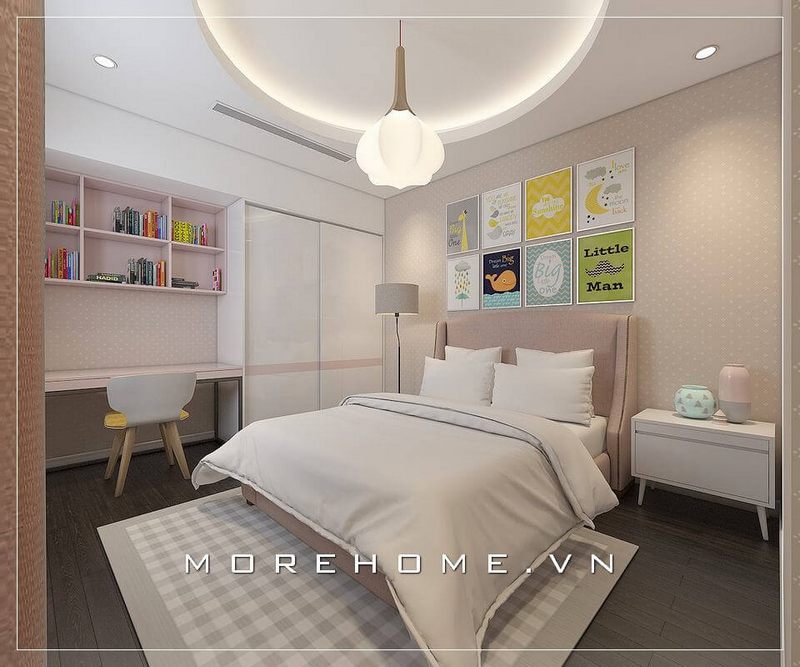 Thiết kế giường ngủ trẻ em phong cách hiện đại, với tone màu trắng chủ đạo cùng màu với nội thất khác trong căn phòng mang đến sự đồng bộ và thoáng đãng