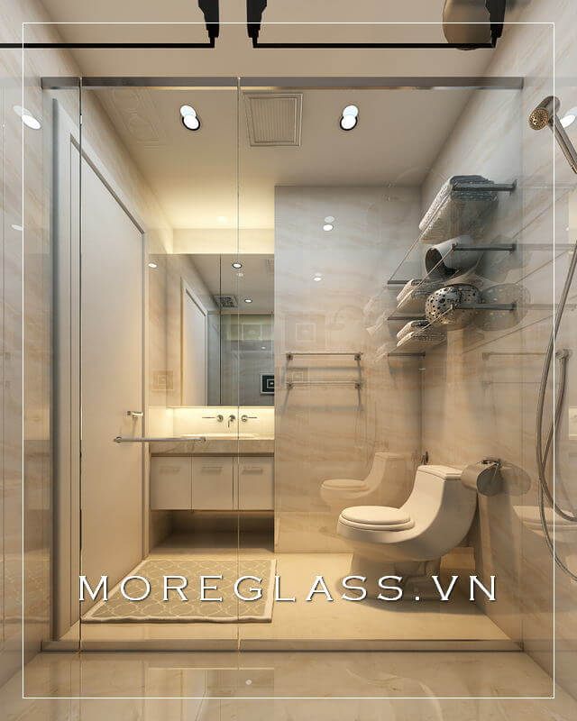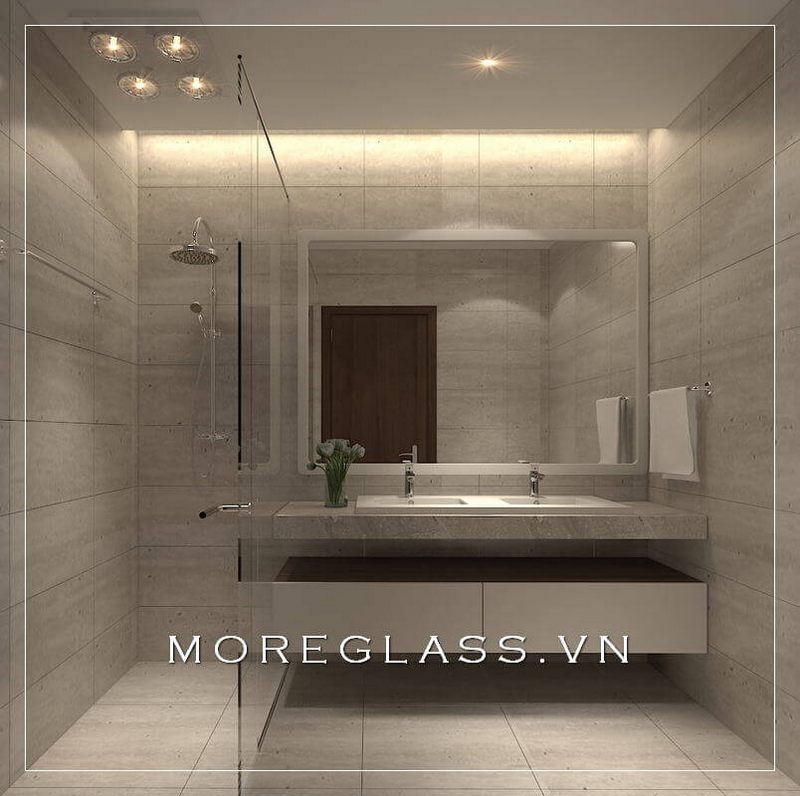 Phòng tắm hiện đại được thiết kế với những kệ tủ trang trí, tủ lavabo đơn giản nhưng hiện đại, cùng với các thiết bị vệ sinh và phòng tắm kính đẹp.