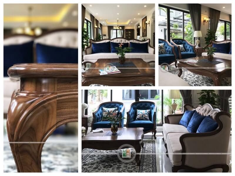 Sofa thư giãn có thiết kế gỗ óc chó tân cổ điển đẹp được trưng bày tại biệt thự Ecopark Hưng Yên.