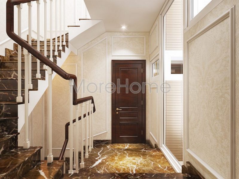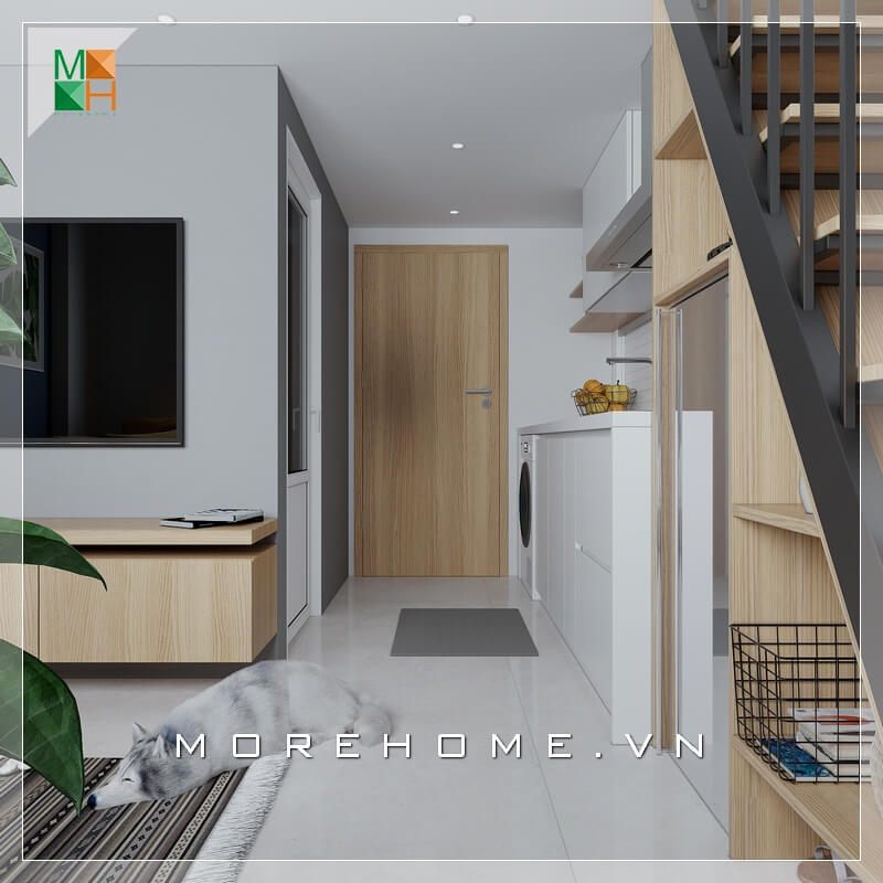 Kệ sắt được trưng bày gần cầu thang lên xuống là một ý tưởng sáng tạo để tiết kiệm diện tích và cung cấp một nơi trưng bày mẫu gỗ hiệu quả nhất.