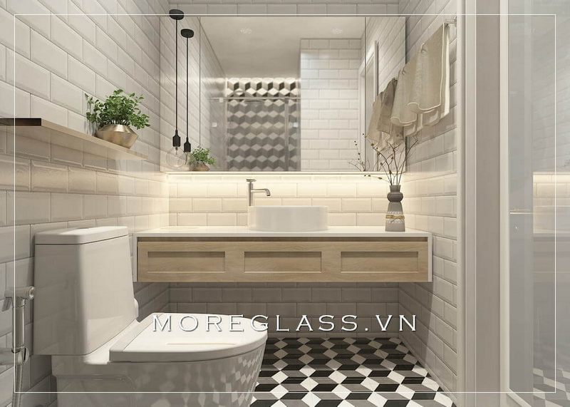 Ngoài ra, hãy cân nhắc việc bố trí các thiết bị chiếu sáng một cách thông minh. Đèn LED âm trần hoặc đèn treo cạnh gương sẽ tạo ra độ chói phù hợp mà không làm mất đi sự ấm áp cần thiết của một nhà tắm. Một mẹo thú vị là sử dụng các đồ decor như khung ảnh hoặc kệ nổi bằng kính – những món đồ này sẽ vừa tạo điểm nhấn thẩm mỹ, vừa góp phần phản xạ ánh sáng, khiến không gian thêm phần lung linh đầy lôi cuốn.