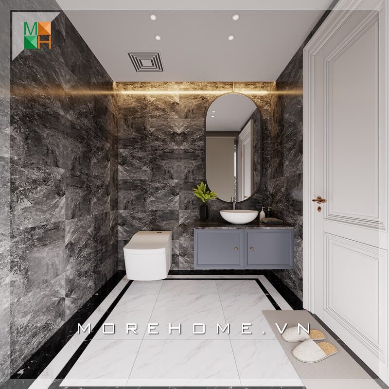 Mẫu thiết kế phòng vệ sinh hiện đại, có diện tích nhỏ gọn với các bố trí nội thất hợp lý, không gian được bố trí hài hòa và các ngăn nắp giúp tạo nên không gian thoáng mát hơn.