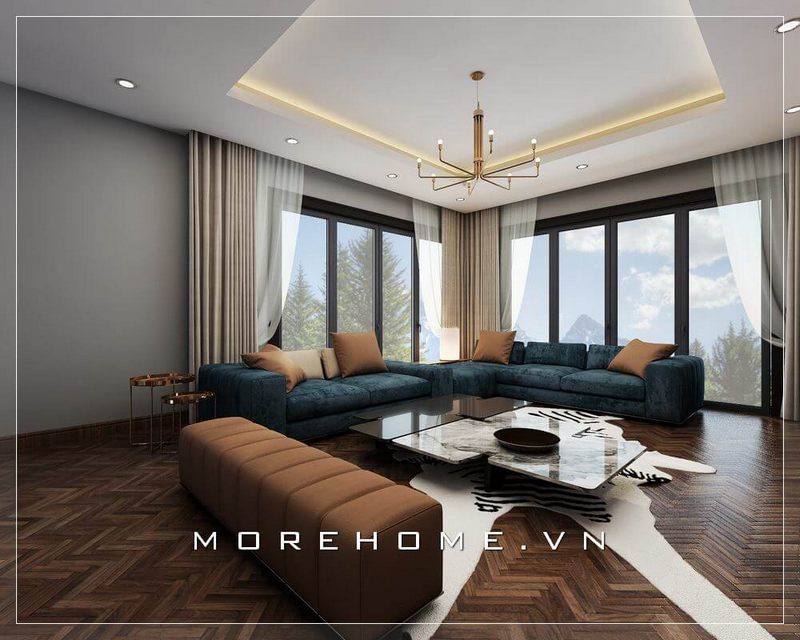 Mẫu thiết kế phòng khách hiện đại với những cánh cửa kính lớn kết hợp bộ sofa bọc nỉ cao cấp tạo nên một không gian thư giãn và tiếp khách tuyệt vời cho gia chủ
